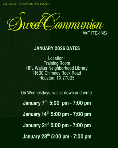 Sweet Communion Write-Ins are free, in-person writing gatherings that create quiet, communal space for Black women to write independently in the presence of one another. Sessions are held in public libraries and community spaces and use the Pomodoro technique to structure uninterrupted writing time.